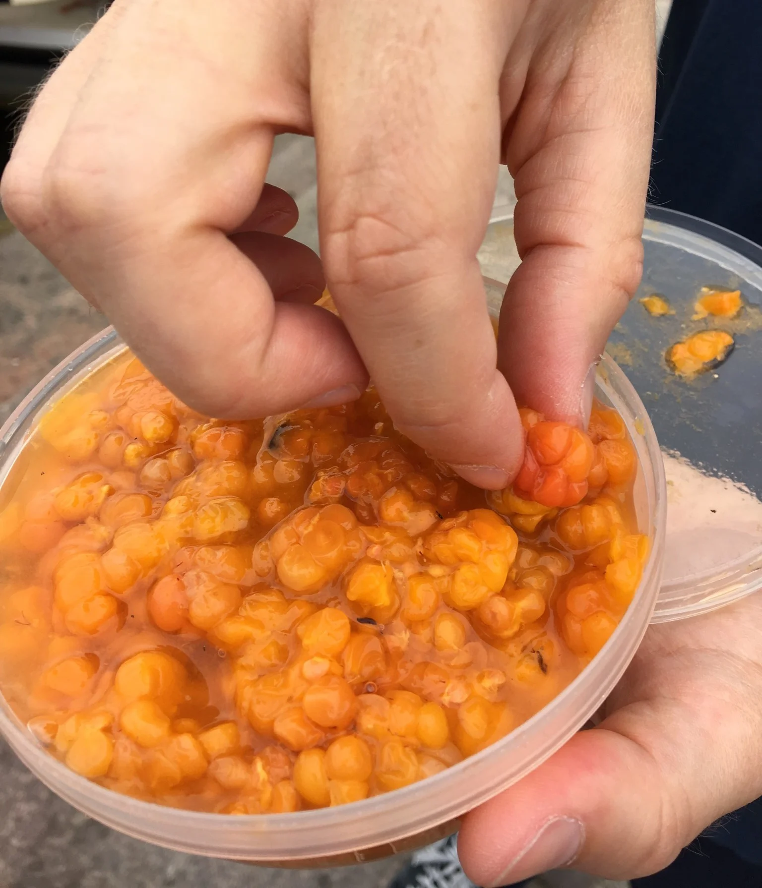 Cloudberries look like orange raspberries except they're not sweet. They are considered a delicacy because they are handpicked and mostly grows in the wild in Lapland, the northernmost part of the country in the Arctic Circle. You can find them at one of the markets.